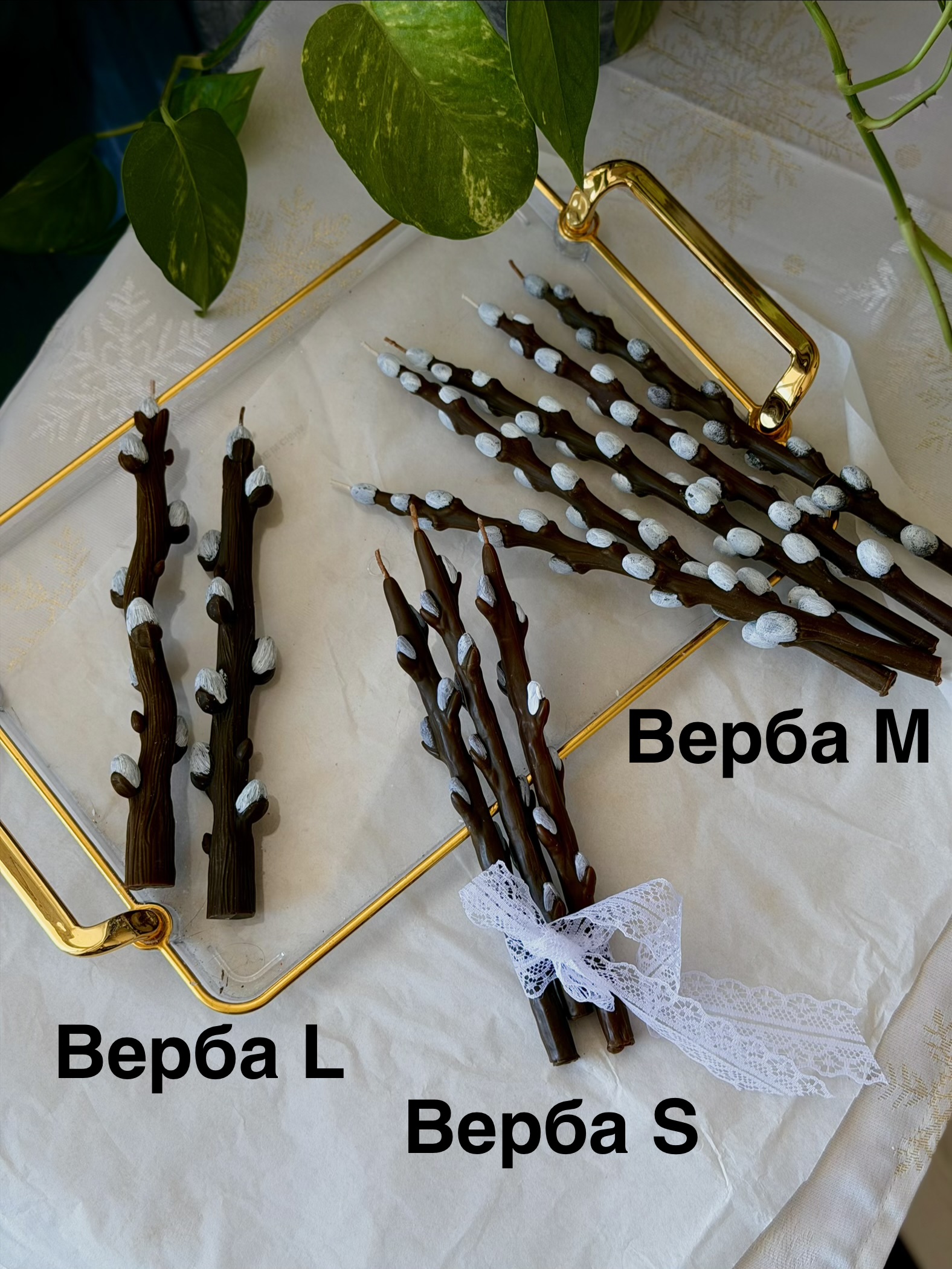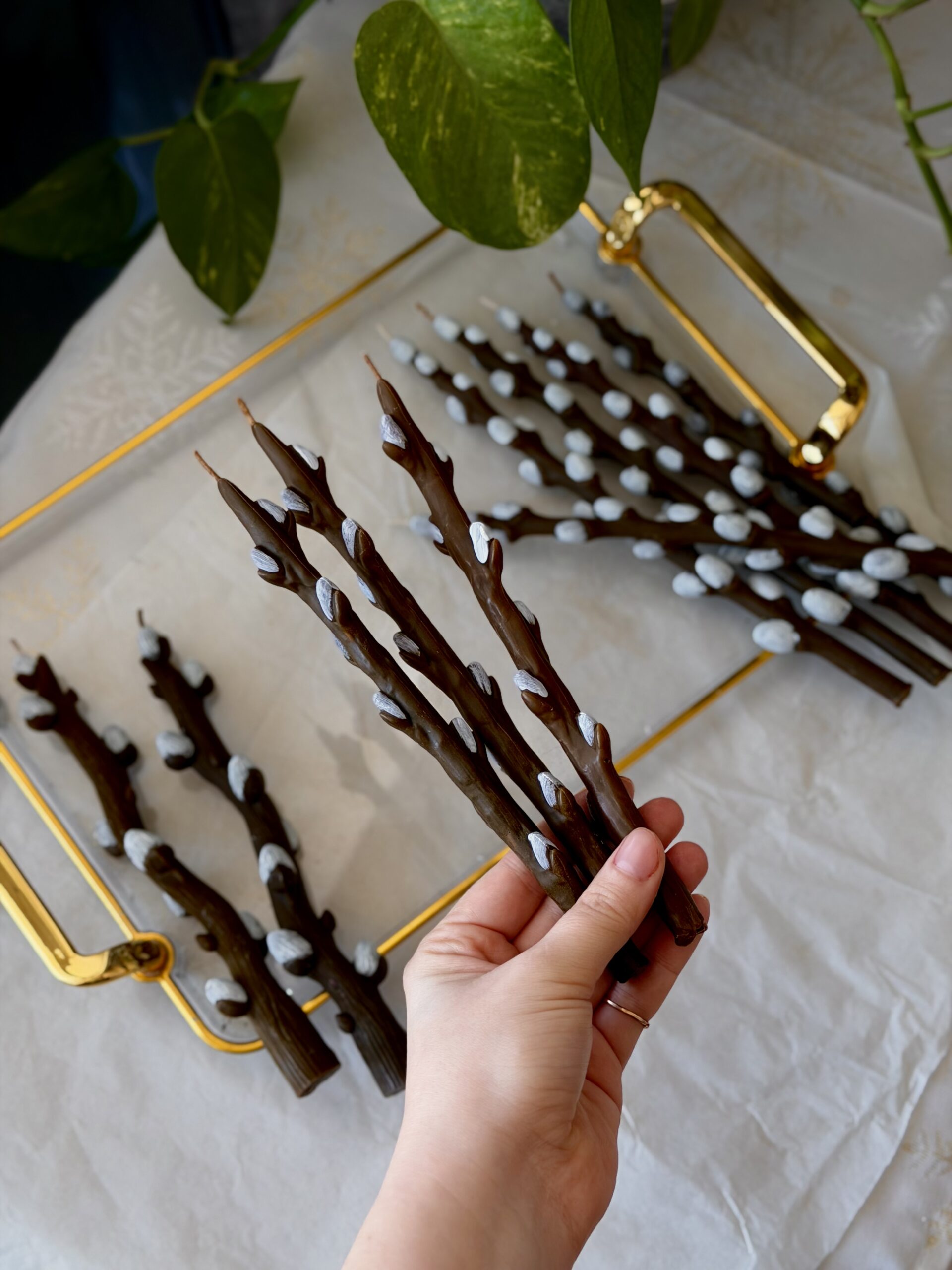 весняна свічка у формі гілочки верби з ніжними “котиками” — символом оновлення, світла та Великодня.