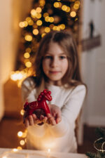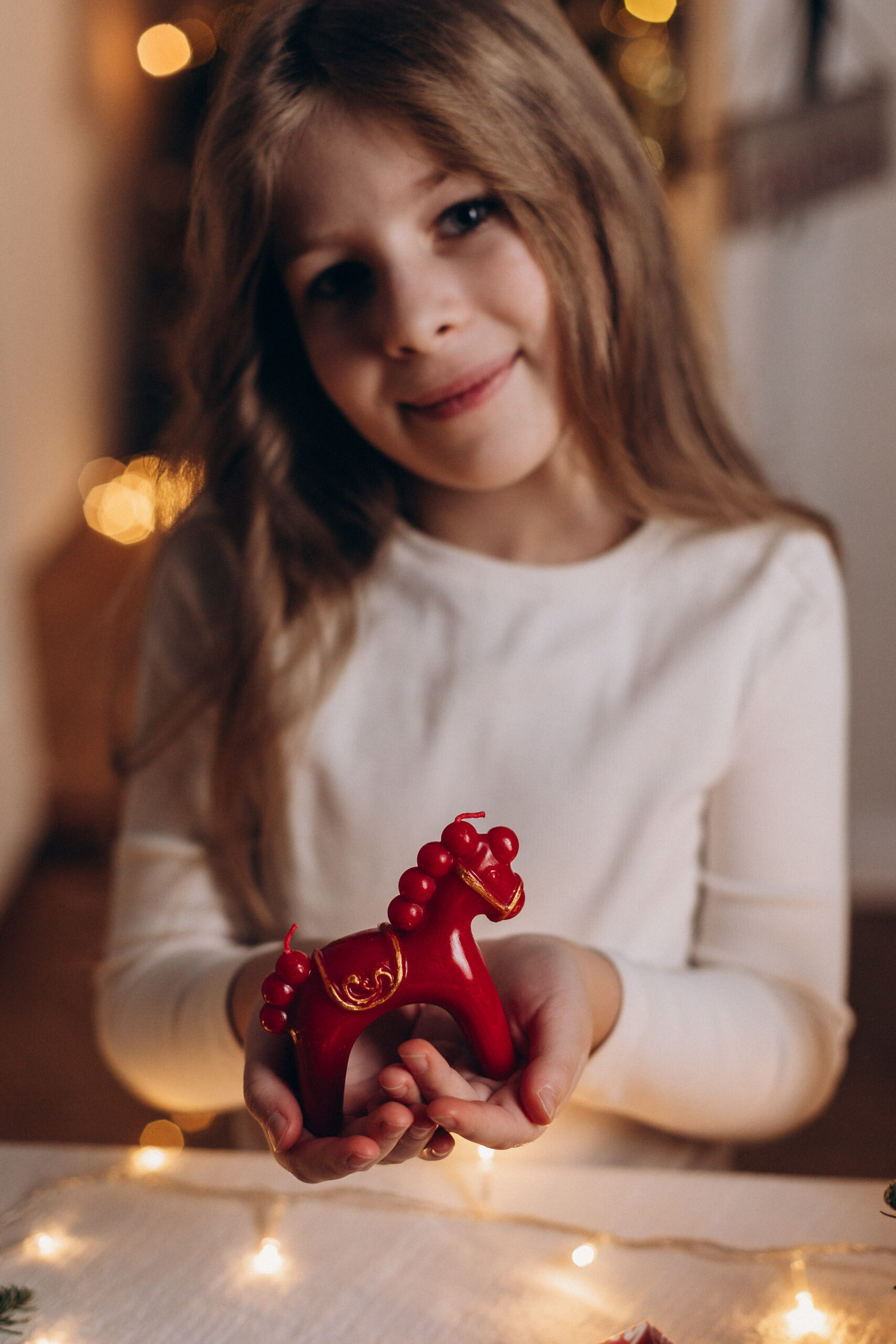 Кожна деталь — від округлих “гривасто-казкових” форм до золотого декору — створена вручну. Це свічка, яка приносить у дім відчуття свята ще до того, як запалає. Вона виглядає як іграшка з новорічного фільму, яку дуже хочеться тримати у руках — як це роблять діти на фото.