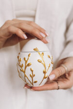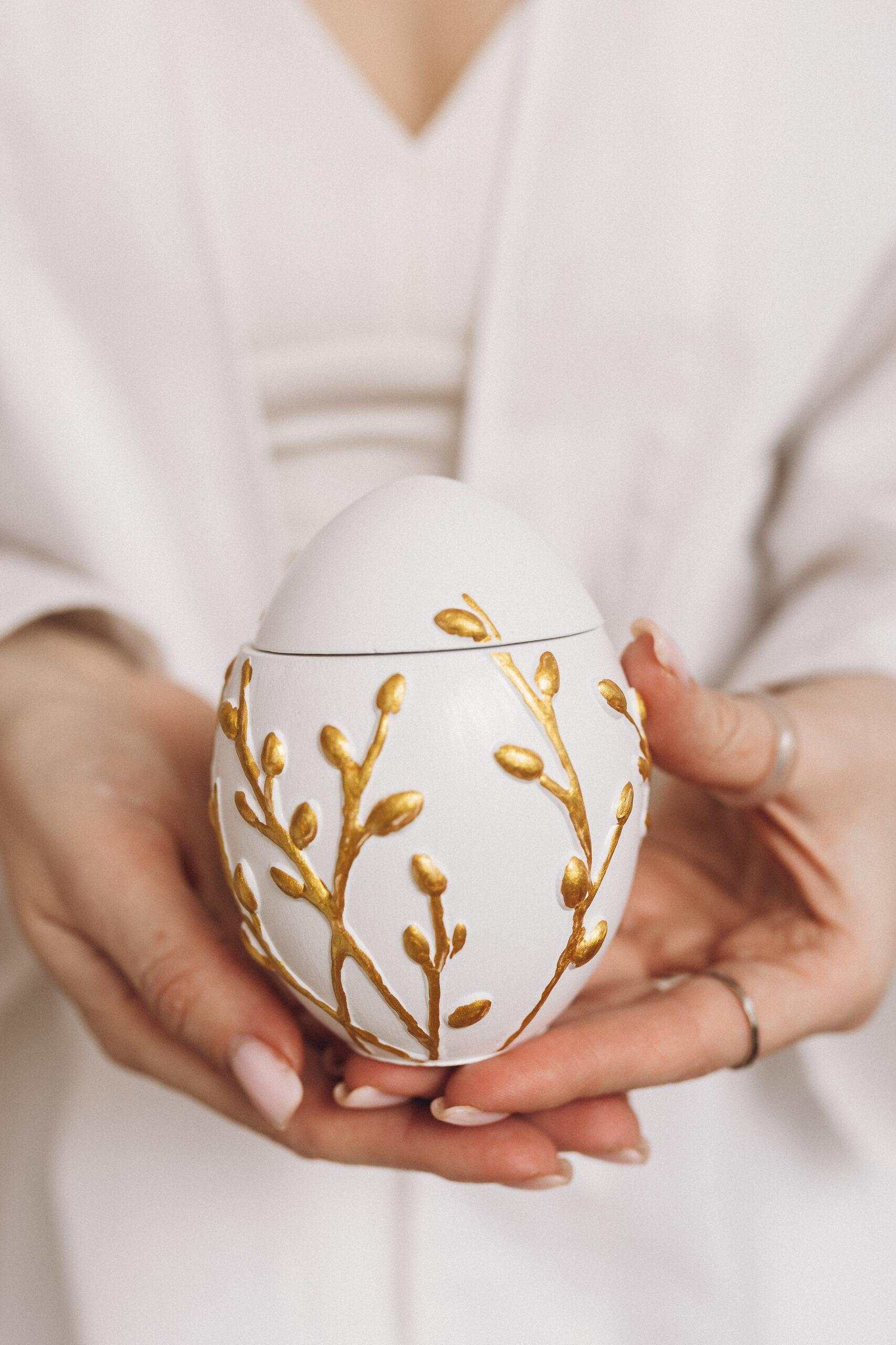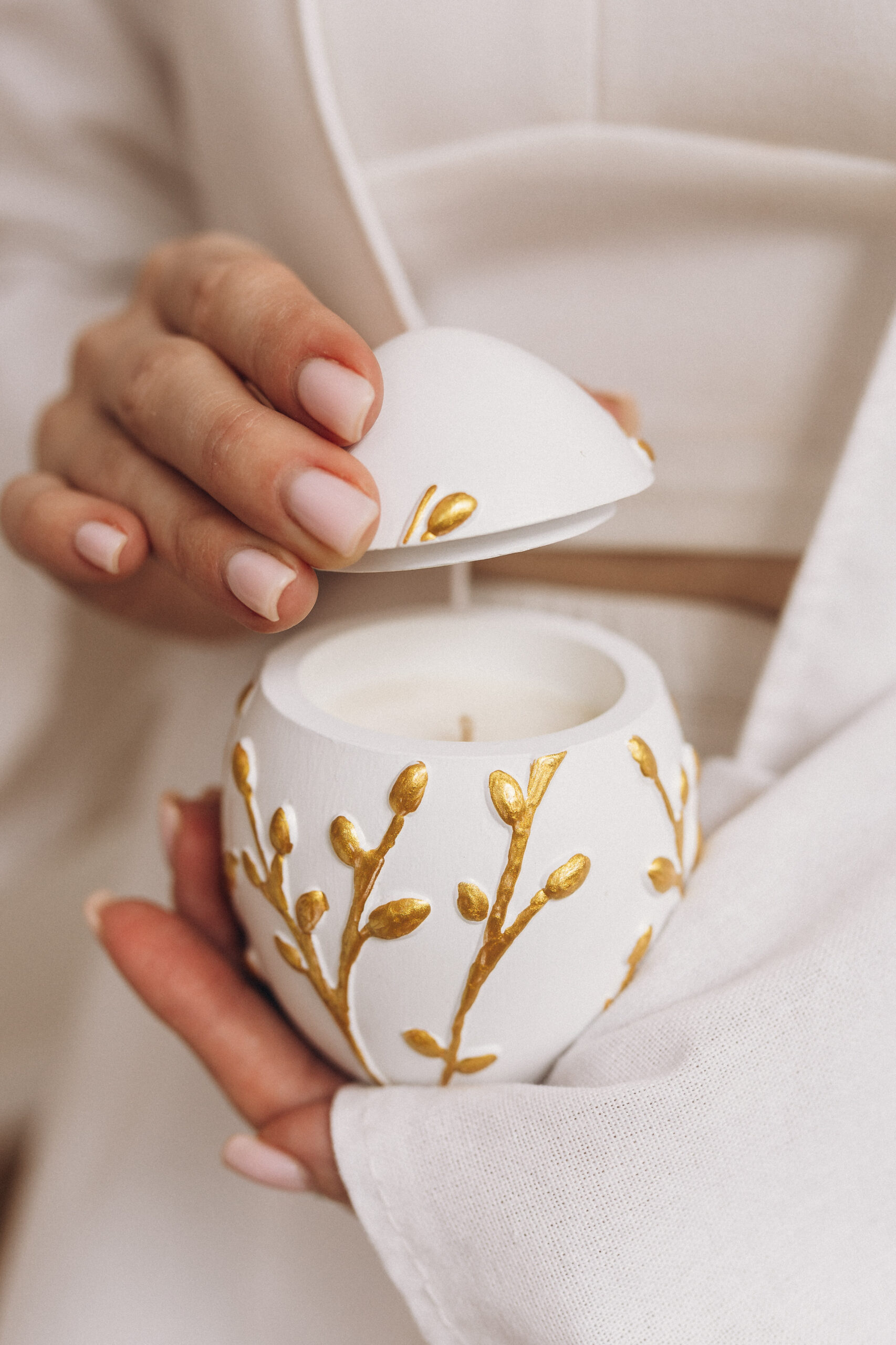 Ніжна ароматична свічка у кашпо у формі яйця, прикрашена золотими вербовими гілочками — символом весни, оновлення та Великодня.